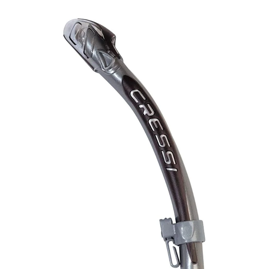 Der Schnorchel Cressi Corfu ist mit einem Spritzschutz ausgestattet, der das versehentliche Eindringen von Wasser bei Wellengang verhindert. Die Konstruktion ist so ausgelegt, dass der Luftstrom nicht beeinträchtigt wird. Der untere Teil hat eine glatte, geriffelte Innenseite aus Silikon, die dafür sorgt, dass das Mundstück immer richtig positioniert ist und den Atemregler nicht behindert, wenn er in den Mund genommen wird.