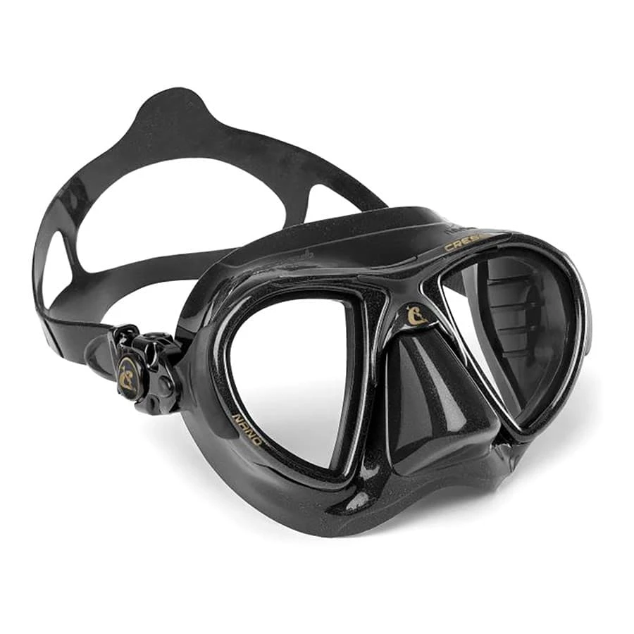 Die Tauchmaske Cressi Nano mit klaren Gläsern ist eine hochtechnische Maske, die durch ihr Design und ihre mittleren Proportionen besticht, sowohl was den Rahmen als auch das Gesicht betrifft. Die dünne, einteilige Fassung ohne Rahmen ist sehr leicht und bringt das Glas erstaunlich nah an die Augen, was Vorteile in Bezug auf die Sicht und die Reduzierung des Innenvolumens mit sich bringt. Seine Stirnfläche reduziert das Innenvolumen auf nur 85 cm3. Außerdem verfügt sie über abgeschrägte Gläser, die in sanft geschwungenen Linien über den Wangenknochen verlaufen und die Sicht darunter verbessern.